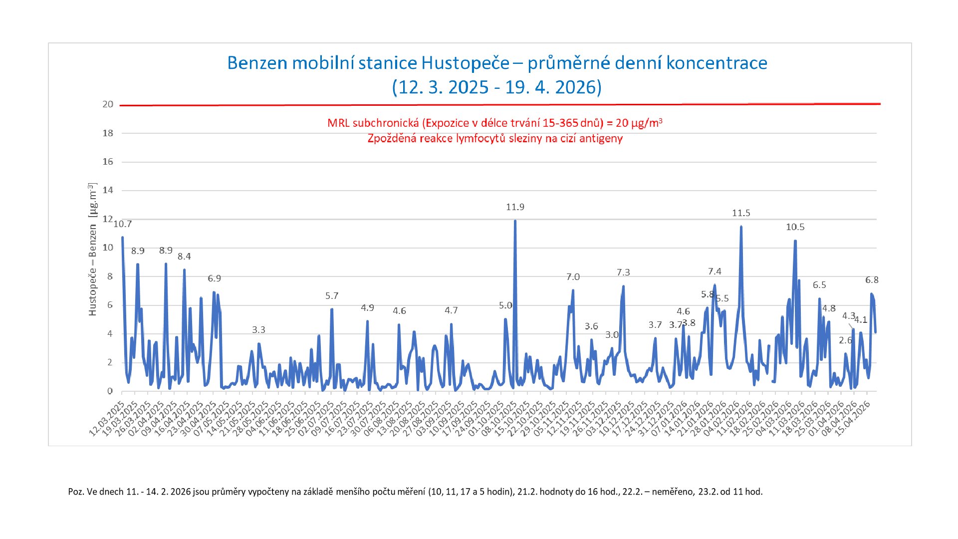 Přepočtené a graficky zpracované průměrné denní koncentrace benzenu v ovzduší Hustopečí (meřící stanice ČHMU).