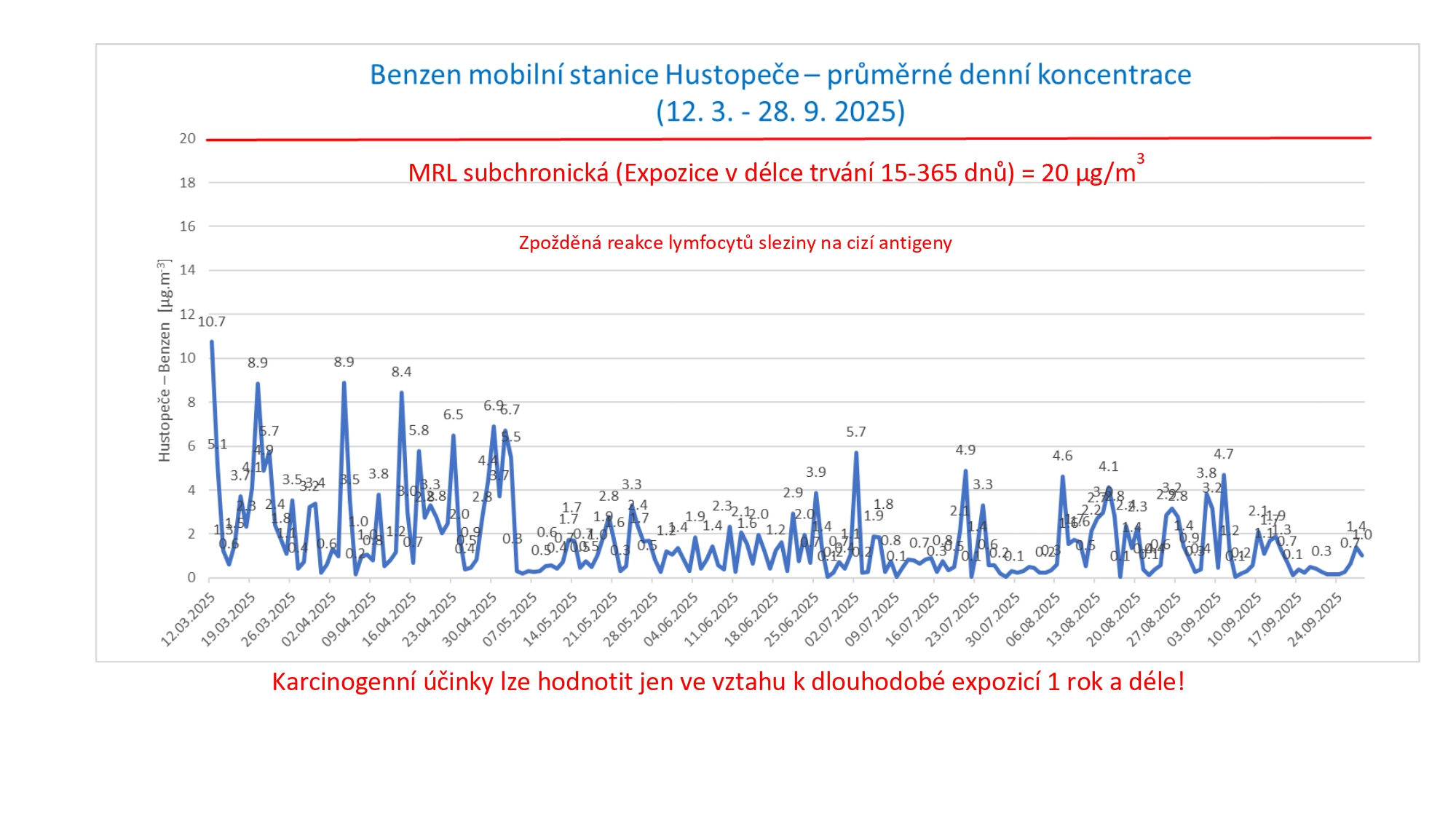 Přepočtené a graficky zpracované průměrné denní koncentrace benzenu v ovzduší Hustopečí (meřící stanice ČHMU).