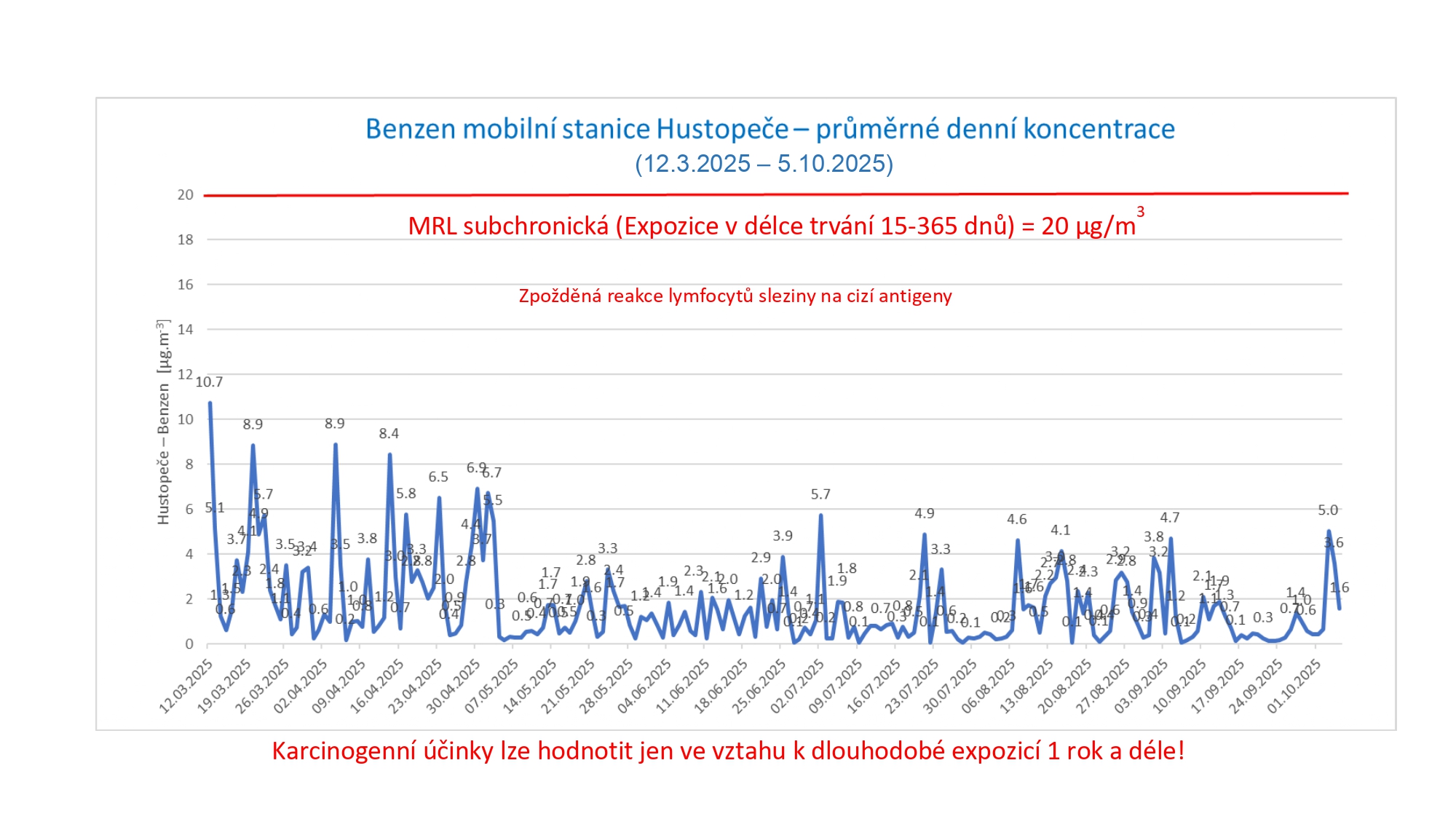 Přepočtené a graficky zpracované průměrné denní koncentrace benzenu v ovzduší Hustopečí (meřící stanice ČHMU).