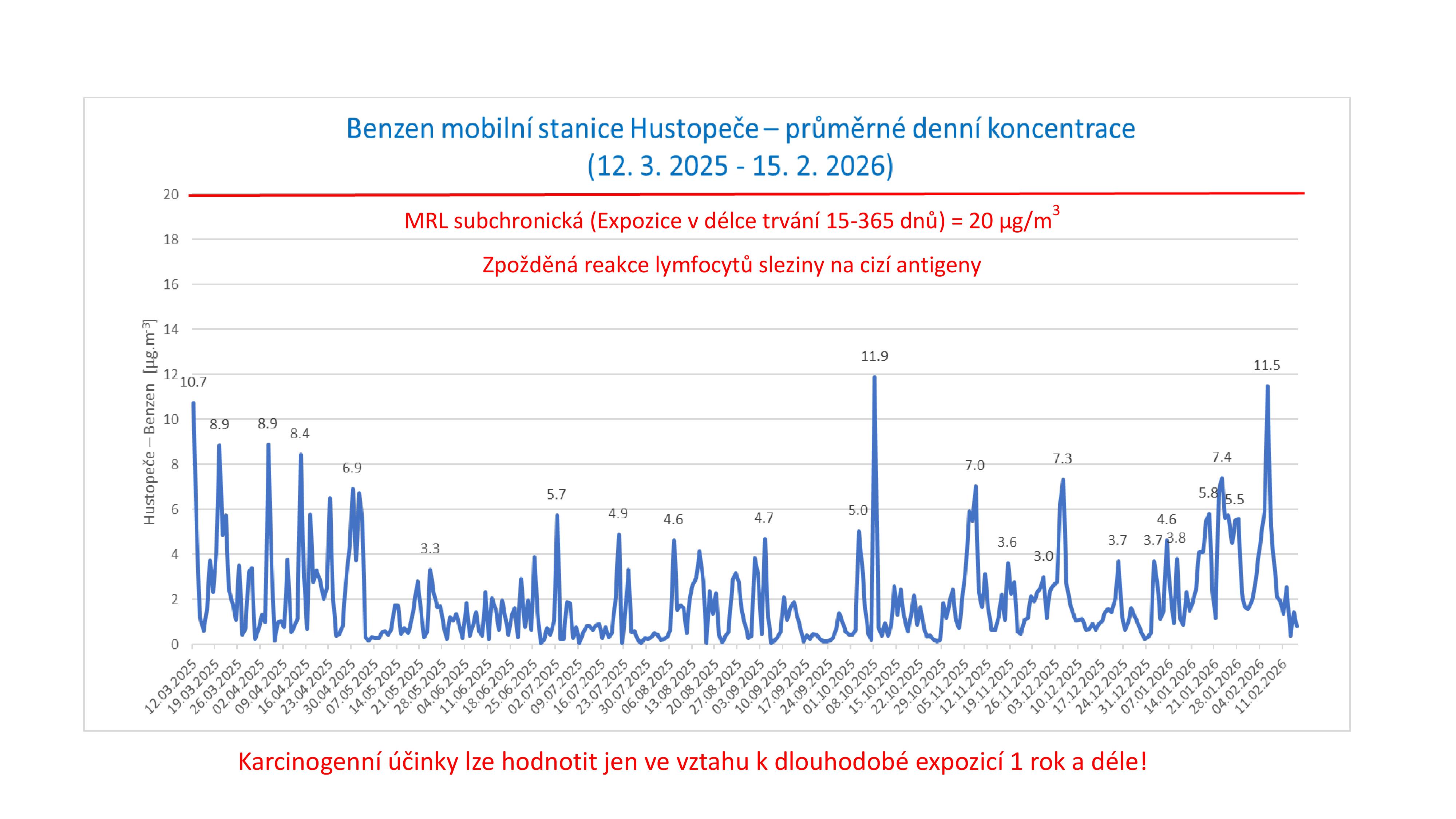 Přepočtené a graficky zpracované průměrné denní koncentrace benzenu v ovzduší Hustopečí (meřící stanice ČHMU).![]()