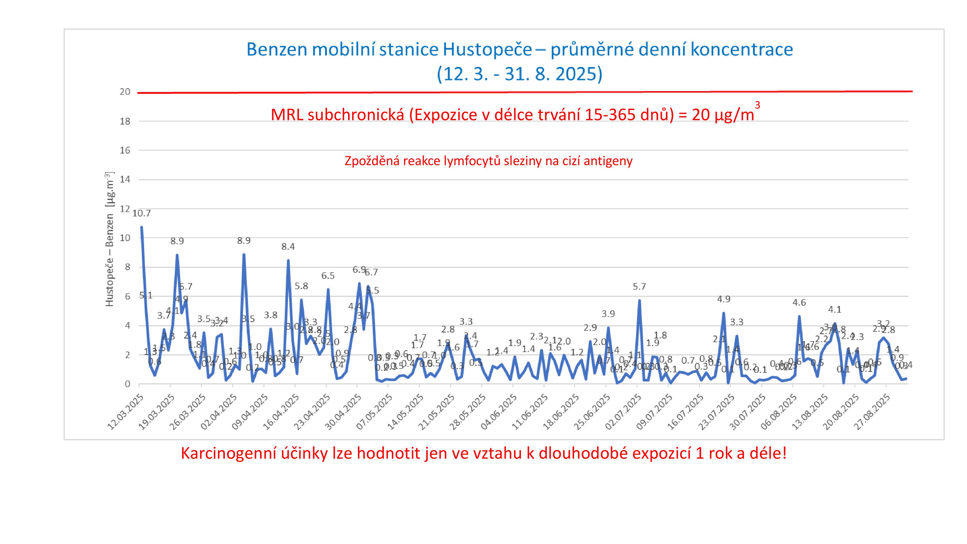 Přepočtené a graficky zpracované průměrné denní koncentrace benzenu v ovzduší Hustopečí (meřící stanice ČHMU).