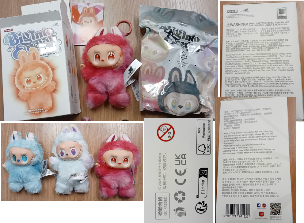 Nebezpečný výrobek - PADĚLEK: hračka/figurka typy LABUBU, THE MONSTERS, Big into Energy údaje/značení: ITEM NO. E6471033, REF NO. 16617, Model číslo: 01202810162, BATCH: 51006-2P1