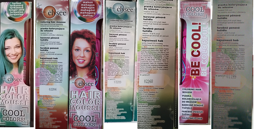 Nebezpečný výrobek - Wats élysée, HAIR COLOR MOUSE, COOL COLORS! barevné pěnové tužidlo, tyrkysový 78, mahagon 46